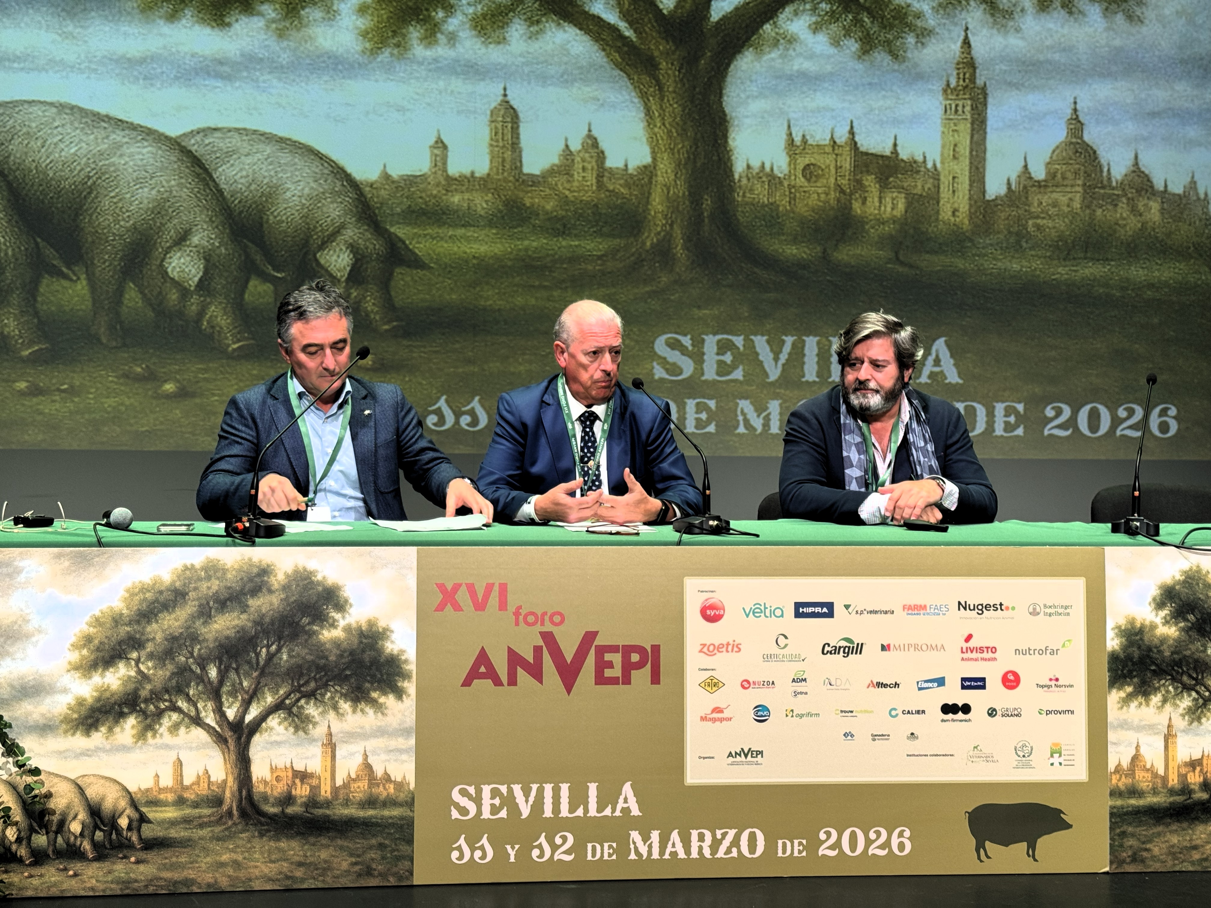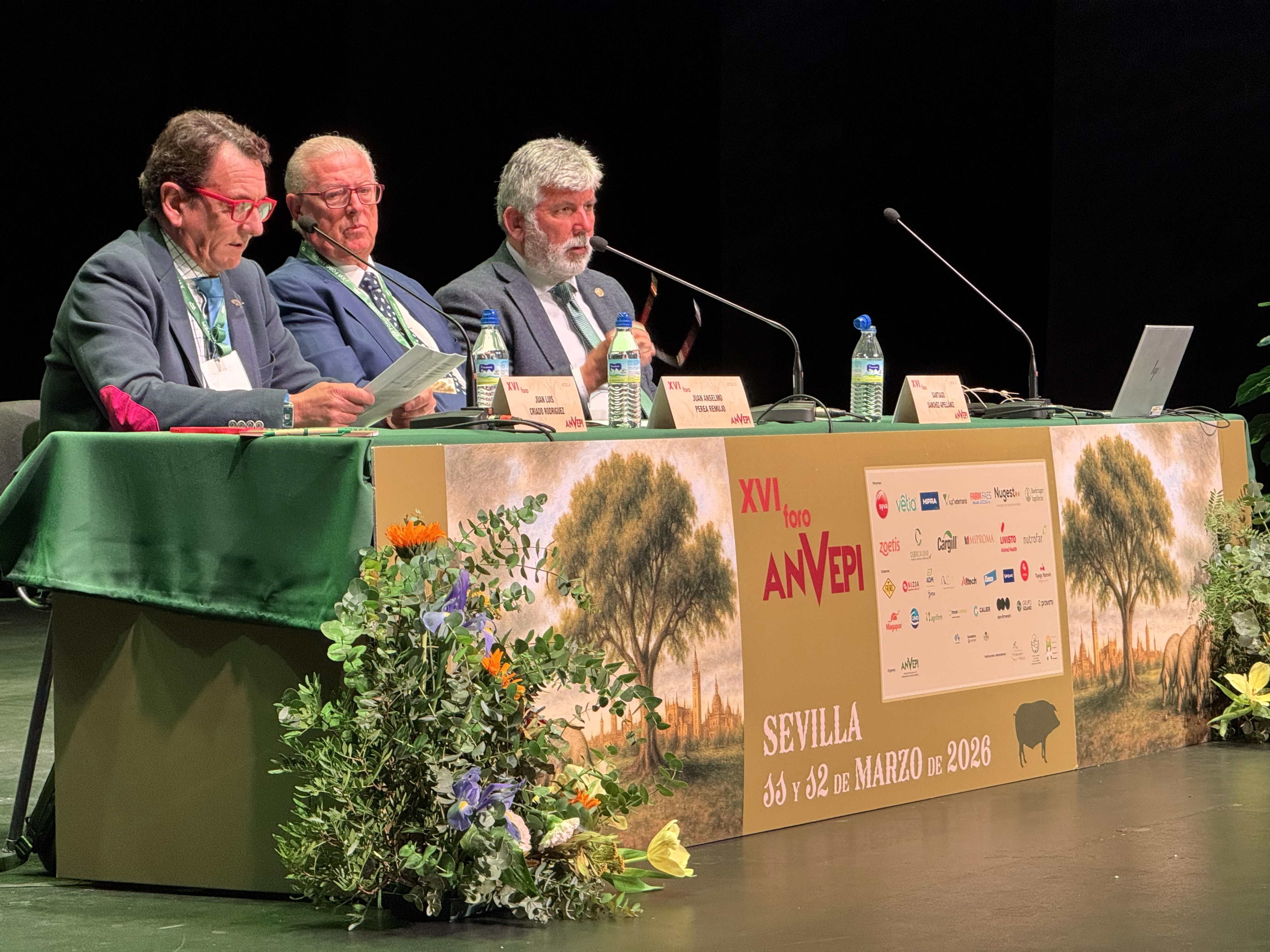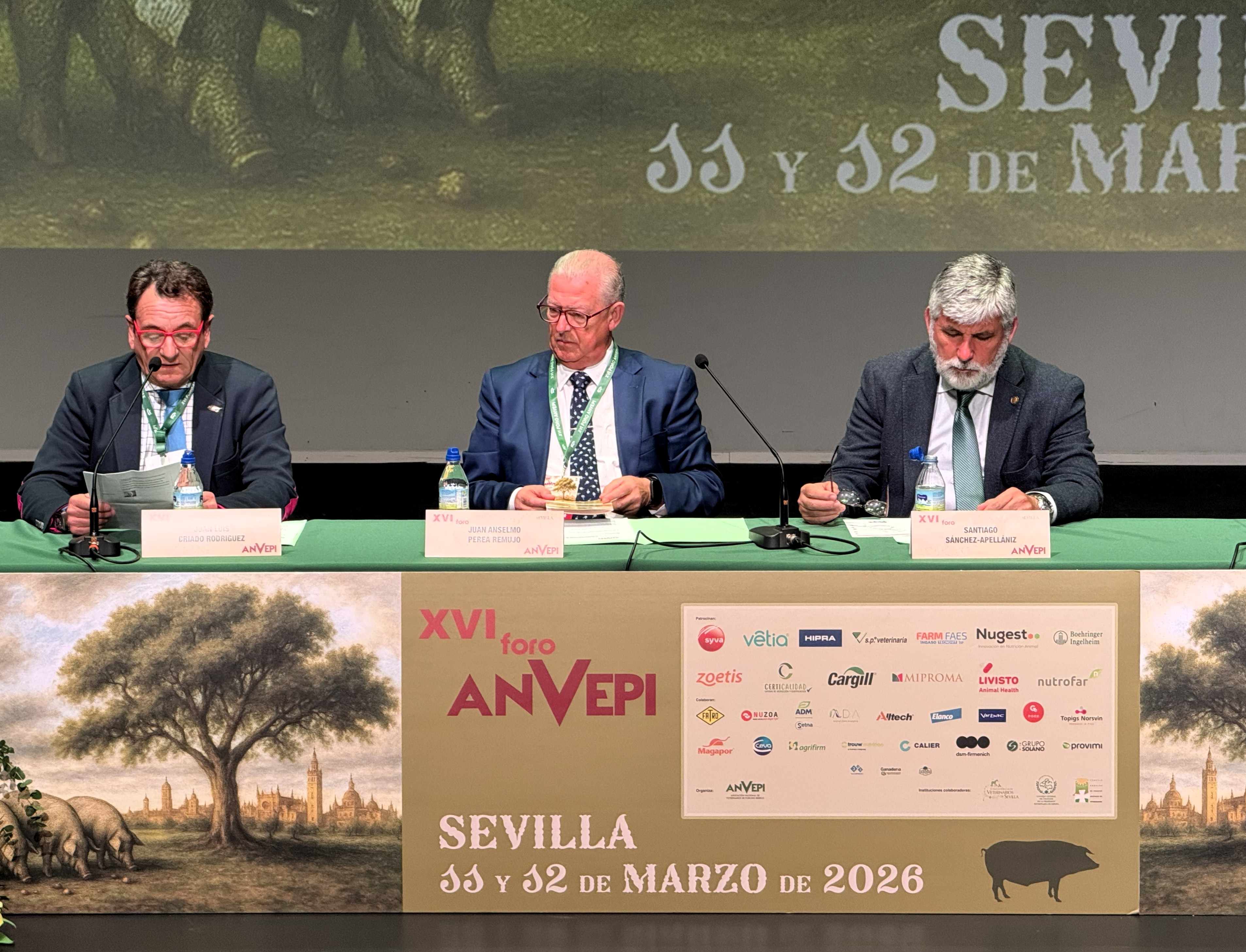 Inauguración XVI FORO. Santiago Sánchez Azpellániz, presidente del Colegio Oficial del Colegio de Veterinarios de Sevilla. Juan Luis Criado, presidente del Comité organizador del XI Foro y J. Anselmo Perea, presidente de ANVEPI.